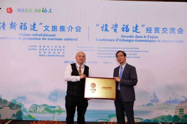 福建省商务厅欧洲处处长陈奇授牌【闽菜馆】 2024年7月1日,借福建省长访问巴黎之机,福建省商务厅欧洲处处长陈奇 向【巴黎大中华酒楼】蔡平配先生授牌【闽菜馆】,弥补了 “123 亮灯”授牌仪式 蔡先生未能亲临参加的遗憾